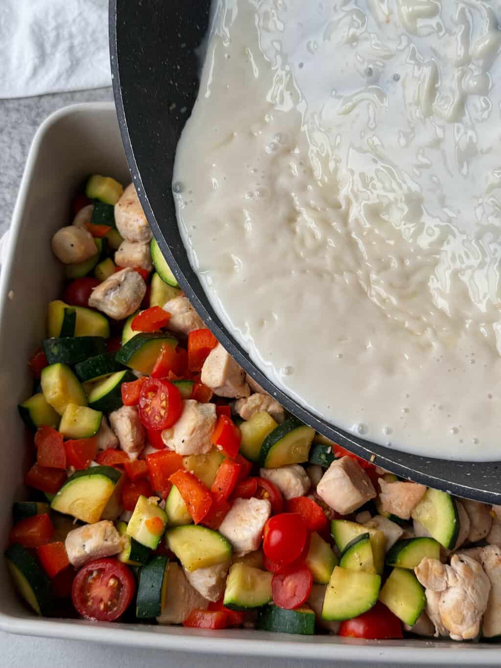 Then pour the cheese sauce over the chicken zucchini veggie mixture.