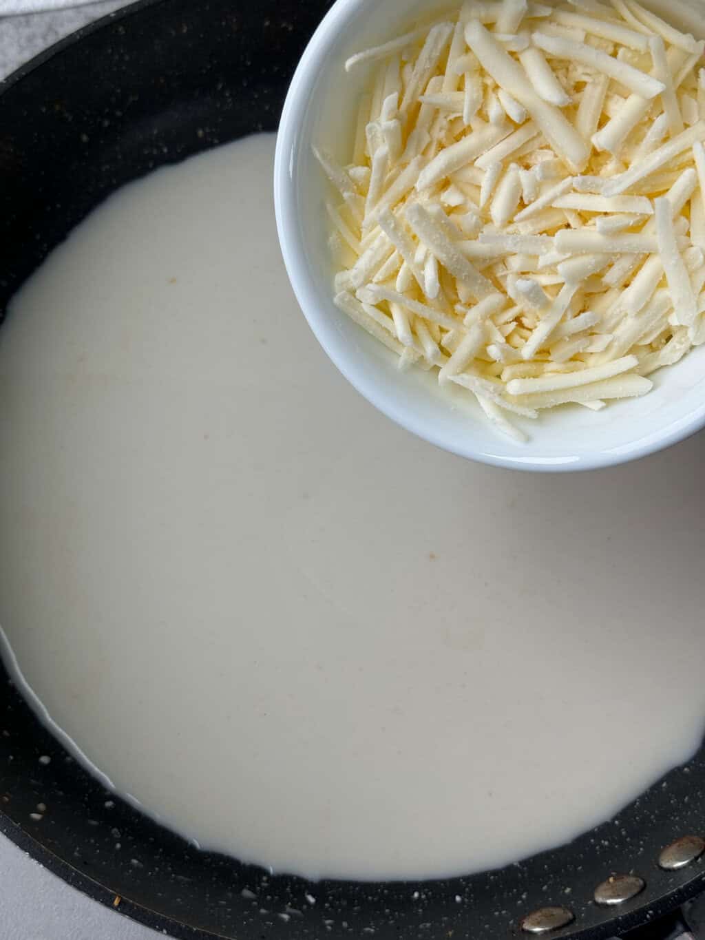 - Next, add the shredded cheese and heat until melted, stirring the whole time.