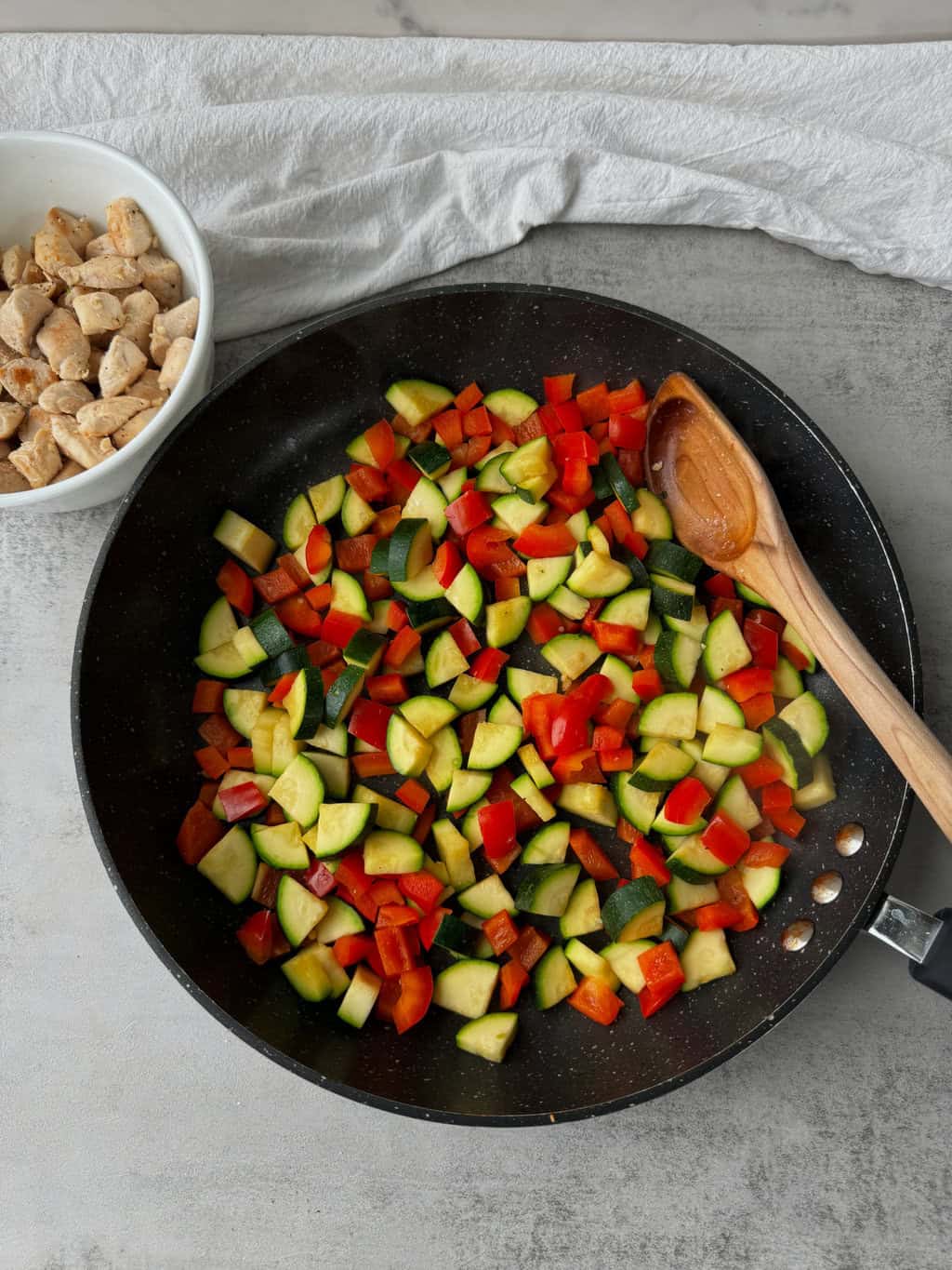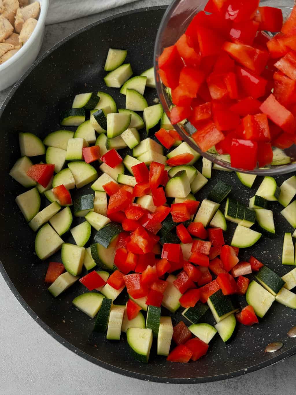 - In the same skillet spray a little oil and cook the zucchini and bell pepper until slightly tender.
