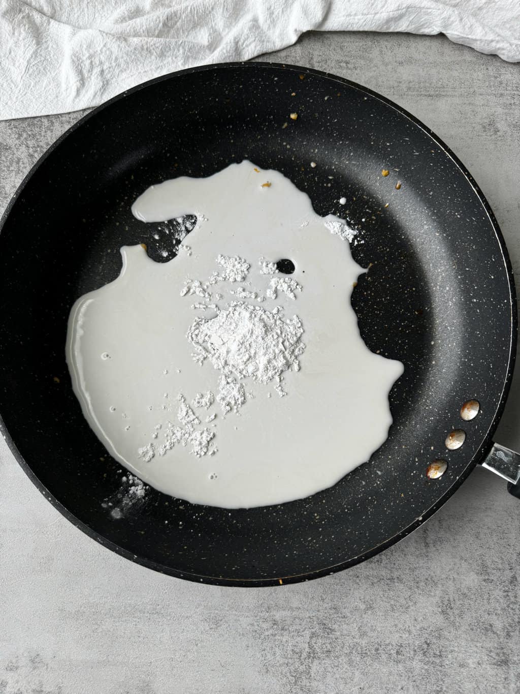 Next, make the cheese sauce by adding the cashew milk and arrowroot powder to the skillet.