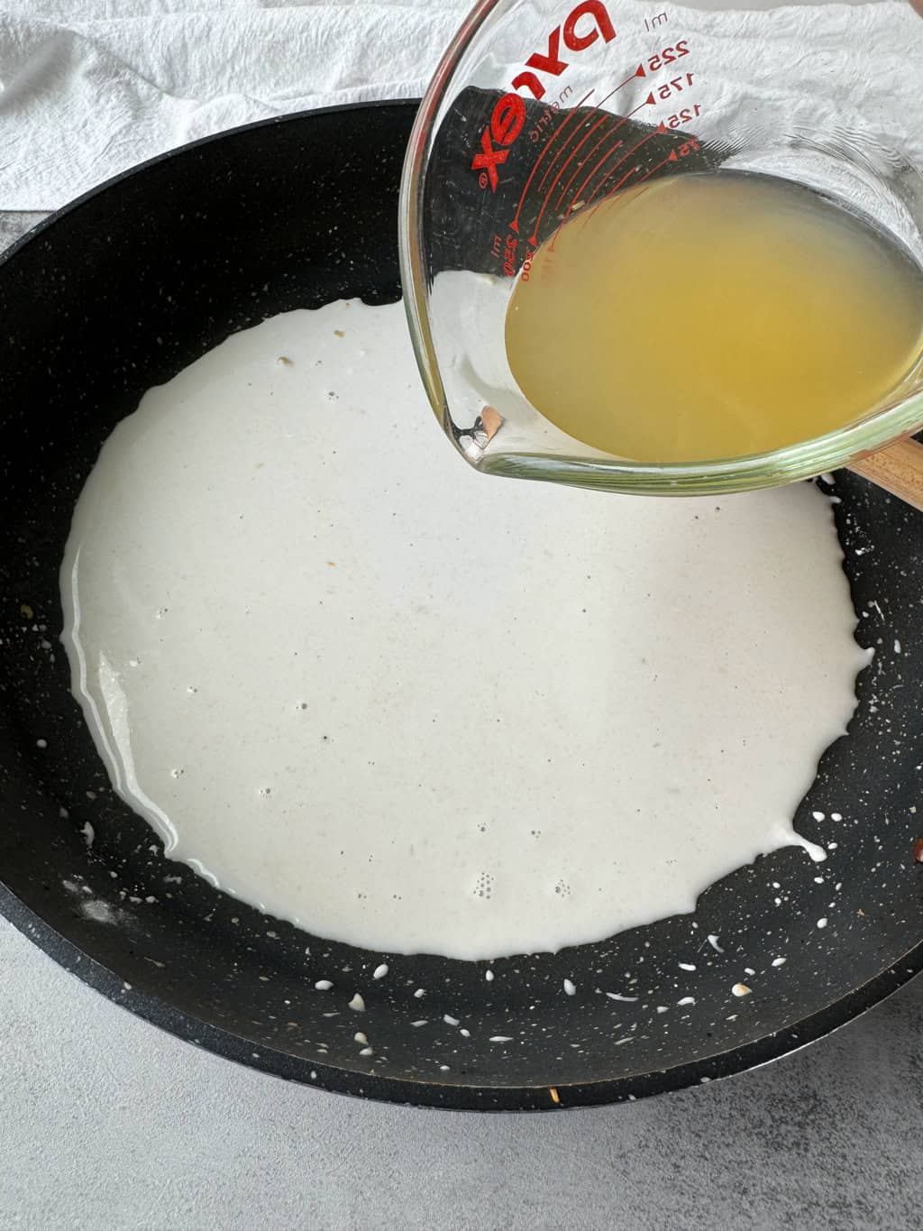 - In the same skillet add the cashew milk and arrowroot powder. Heat over low heat and stir until smooth. Then slowly pour the chicken broth into the skillet.