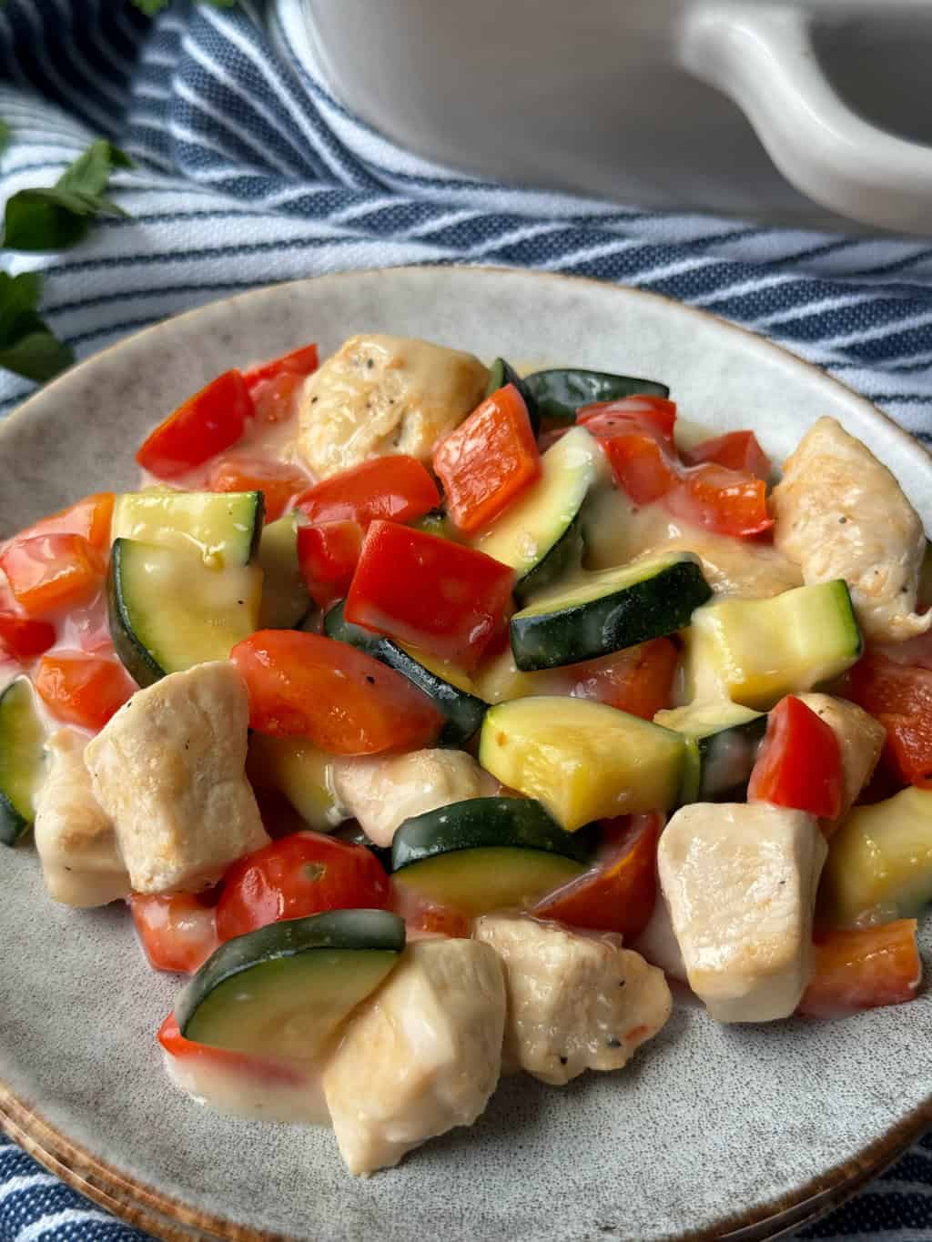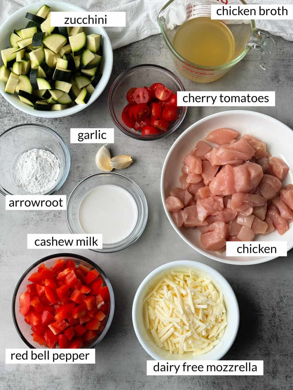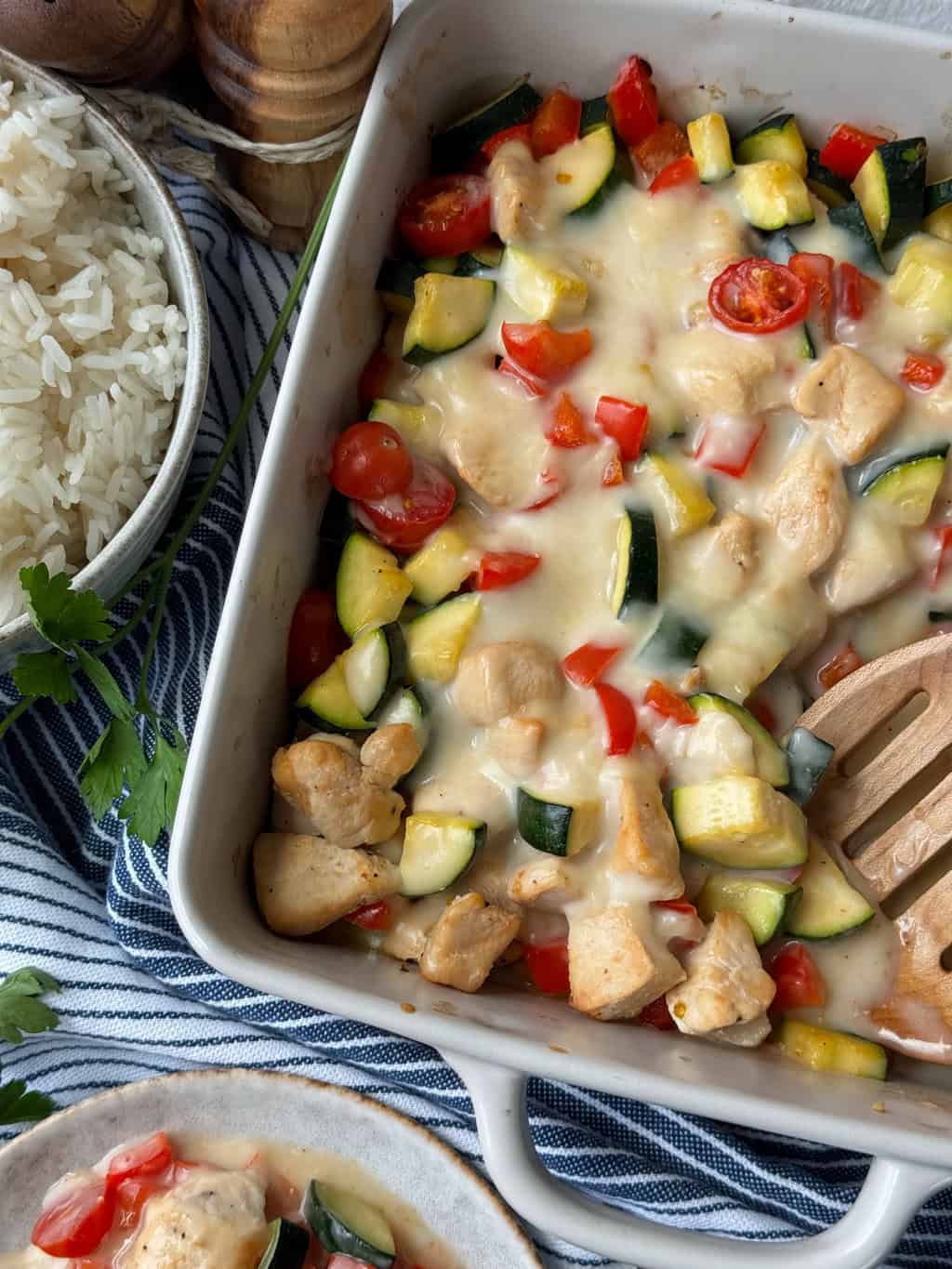 This easy casserole recipe is made with fresh veggies and is naturally gluten-free. With healthy ingredients like fresh zucchini, red bell pepper, sliced cherry tomatoes, and lean pasture-raised chicken you can’t go wrong. The cheesy sauce is made with dairy-free mozzarella cheese, chicken broth, and cashew milk for a light low-carb creamy sauce.