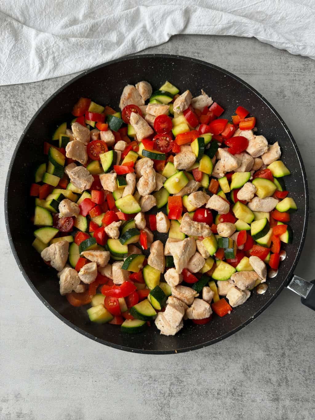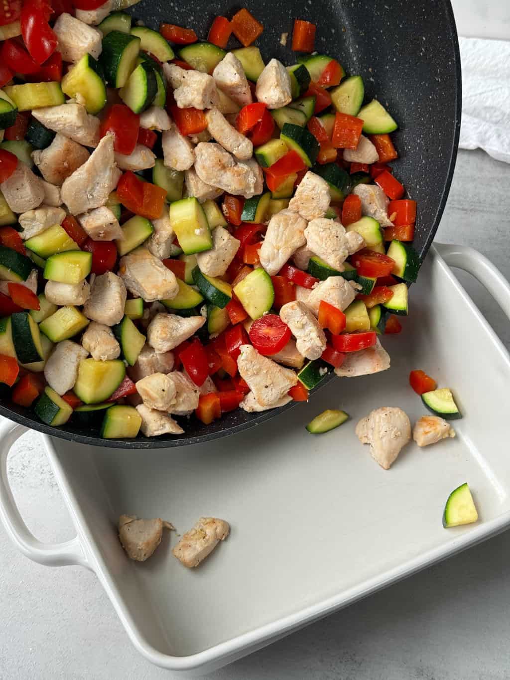 - Stir to combine and then transfer the chicken zucchini mixture to a casserole dish.