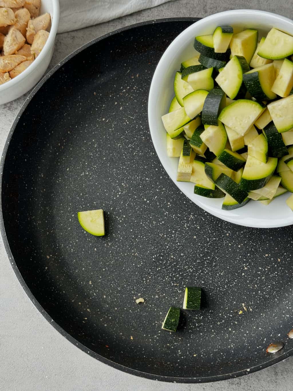 Then set the cooked chicken aside and spray the skillet with a little oil. Add the zucchini to the skillet.
